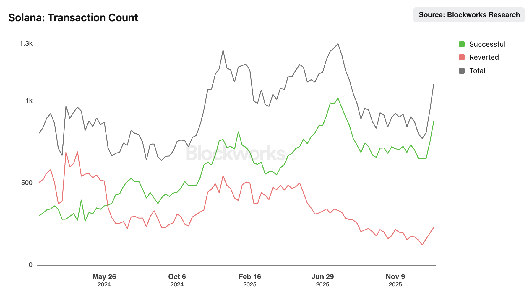 - Transaction Throughput (Non‑vote TPS ~1,000): Solana never quite hit a sustained 1,500 non‑vote TPS, but it’s consistently sat near ~1,000 with sporadic spikes above that mark, sometimes well above. That puts the prediction directionally right but shy of the specific target. More importantly, the network’s success rate has improved and failure rates fallen, so throughput isn’t just high, it’s reliable on real‑world workloads.