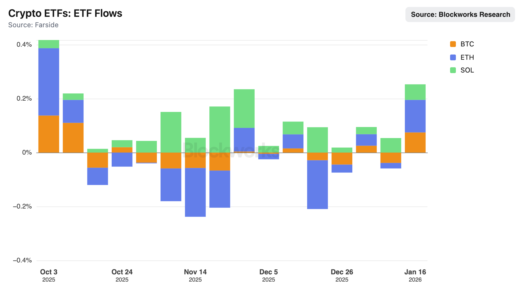 - ETF Inflows (rivaling ETH): The prediction landed smack in late October, when Bitwise launched its SOL ETF — a product that has, until just last week, consistently outperformed both BTC and ETH ETFs on a market cap–adjusted basis. Flows remained net positive through January, with weekly inflows peaking near $500M and daily contributions from products like Fidelity’s FSOL keeping the momentum up. Whether the recent pause marks a plateau or just a breather remains to be seen, but Solana’s arrival in the ETF era is no longer a hypothetical — it’s happened, and it's working.